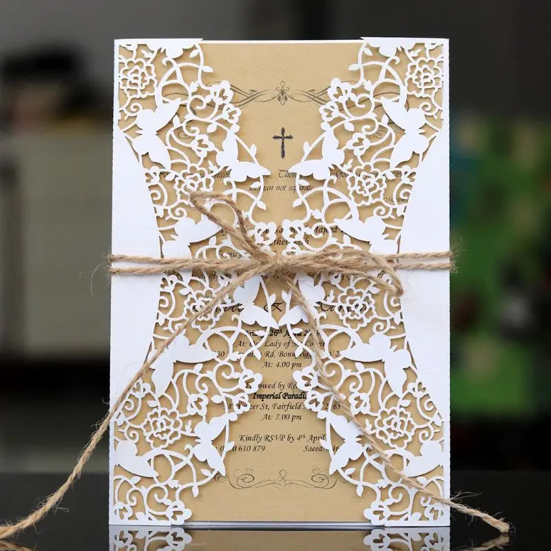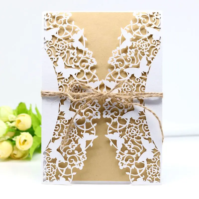 10pcs/set Laser Cut Hollow Wedding invitations Cards Lace Hemp Rope Invite Envelopes Kits For Engag