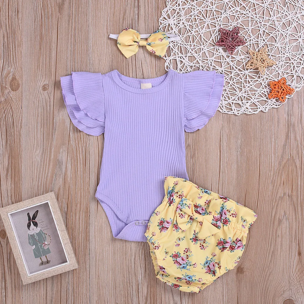 Infant Baby Girls Set Short Sleeve Solid Short Romper +Floral Shorts+Headband babykleding meisje zo