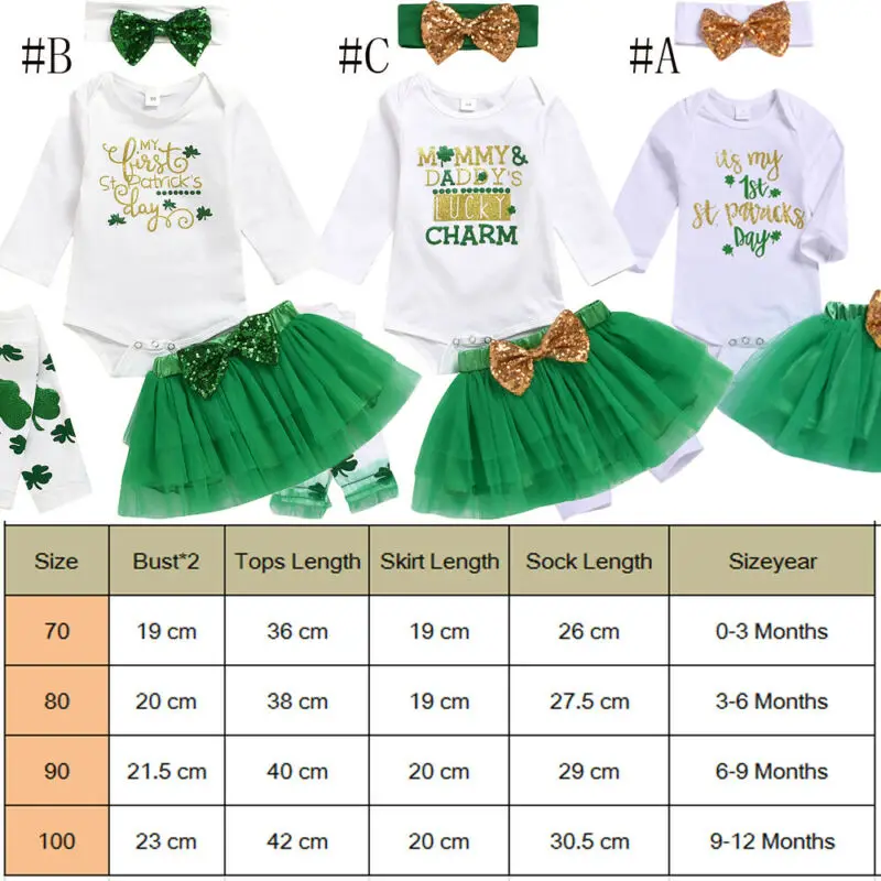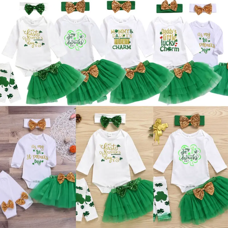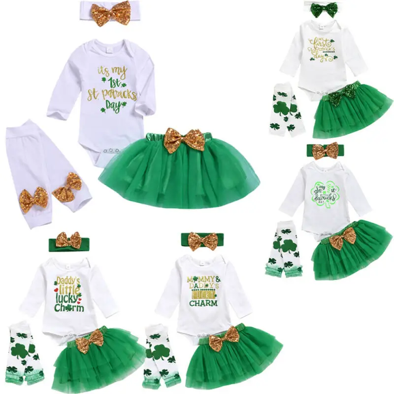ORIGINAL 4Pcs Baby Kid Girl St.Patrick's Day Clothes Romper Top+Tutu Skirts Party Outfits