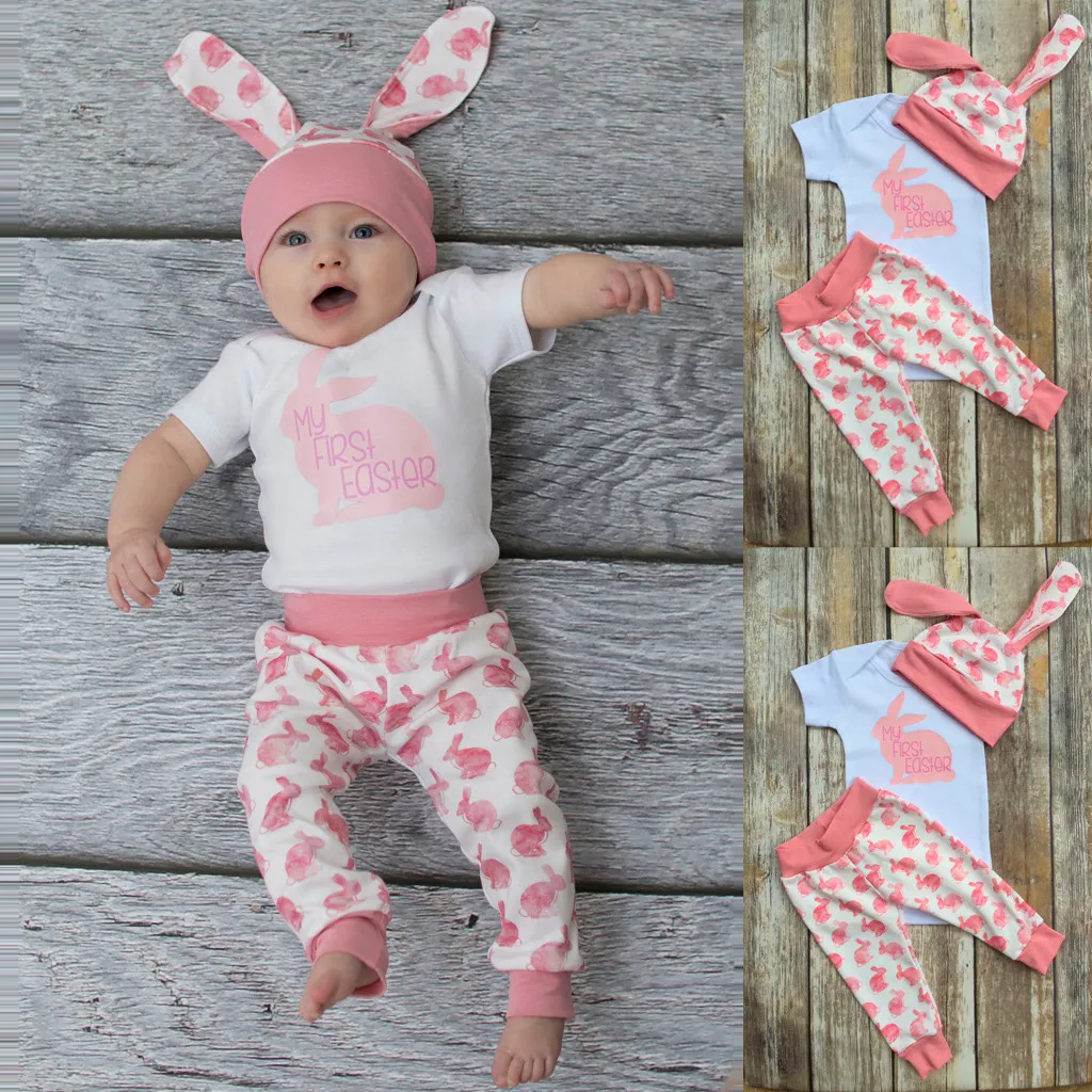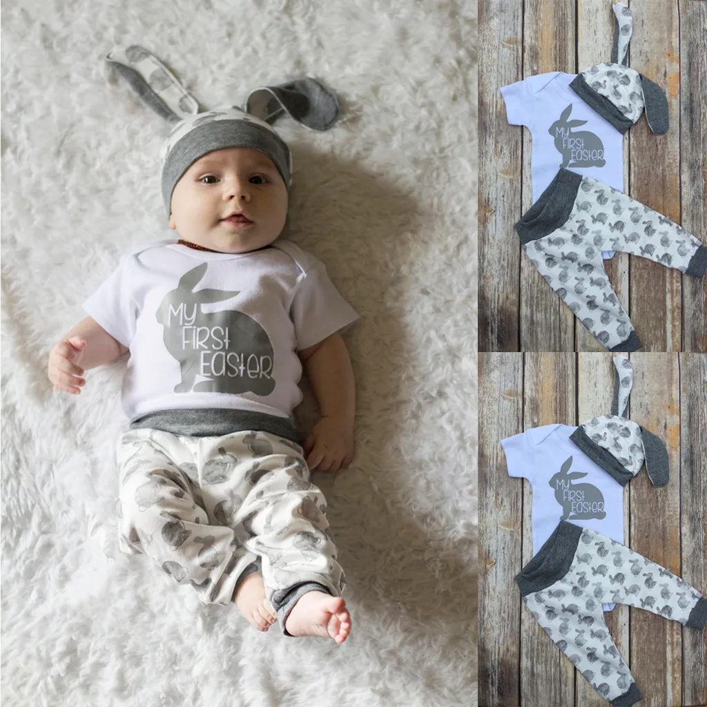 Review Top Newborn Baby Girl Boy Cartoon First Easter 3D Bunny Outfits Romper Hat Pants Set